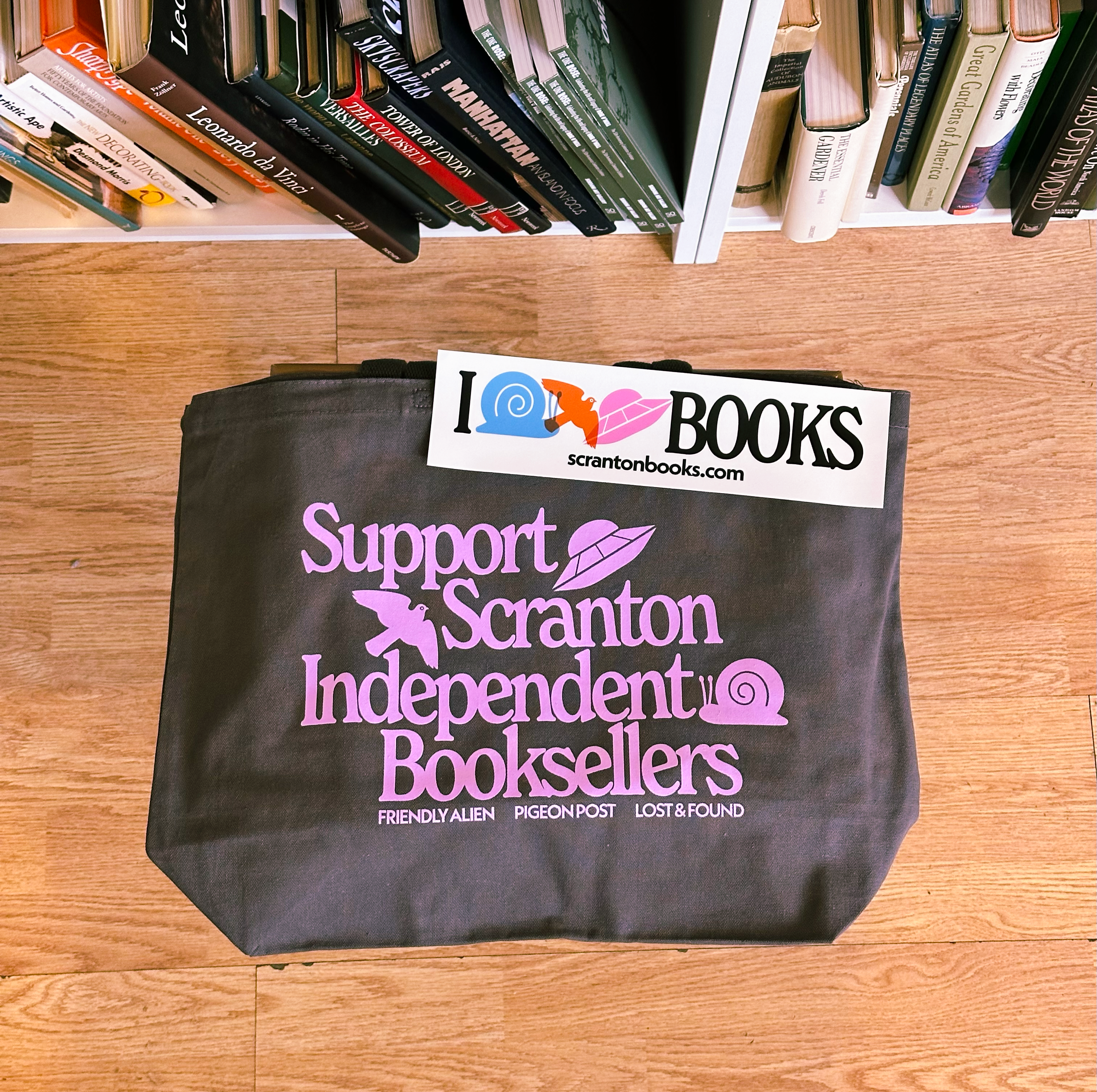 3 bookstores all within walking distance. Tote bags and bumper stickers to celebrate Independent Bookstore Day Apr. 24, 2026!